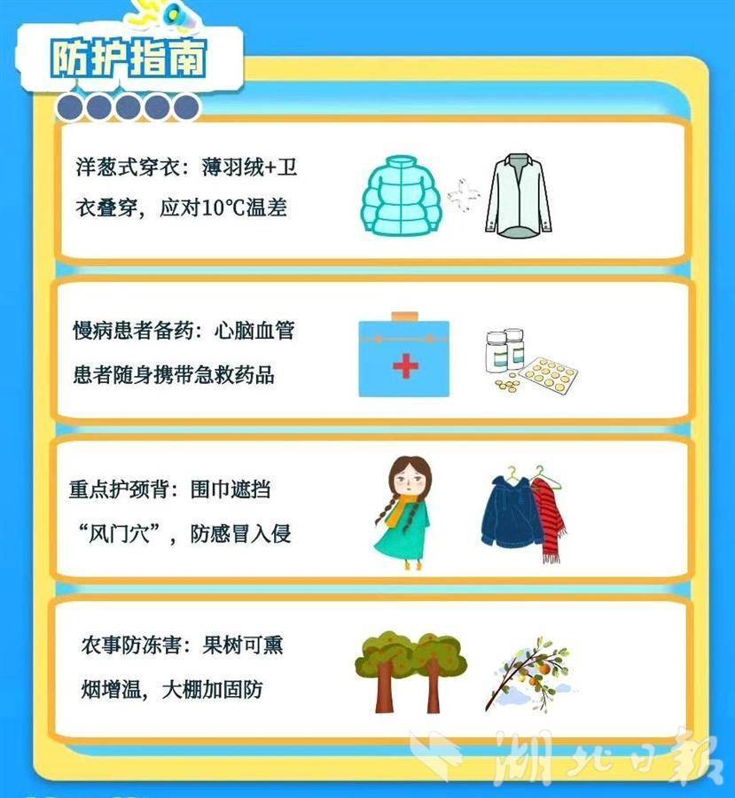 武汉市气象局提醒市民朋友,注意添衣保暖;同时,倒春寒天气将影响早稻、玉米等春播进度,导致早稻、春玉米、大豆和定植蔬菜烂秧烂苗增加,出苗率下降,建议对已播种的玉米、大豆幼苗,有条件的可采用覆膜覆盖等方式防治冷害。