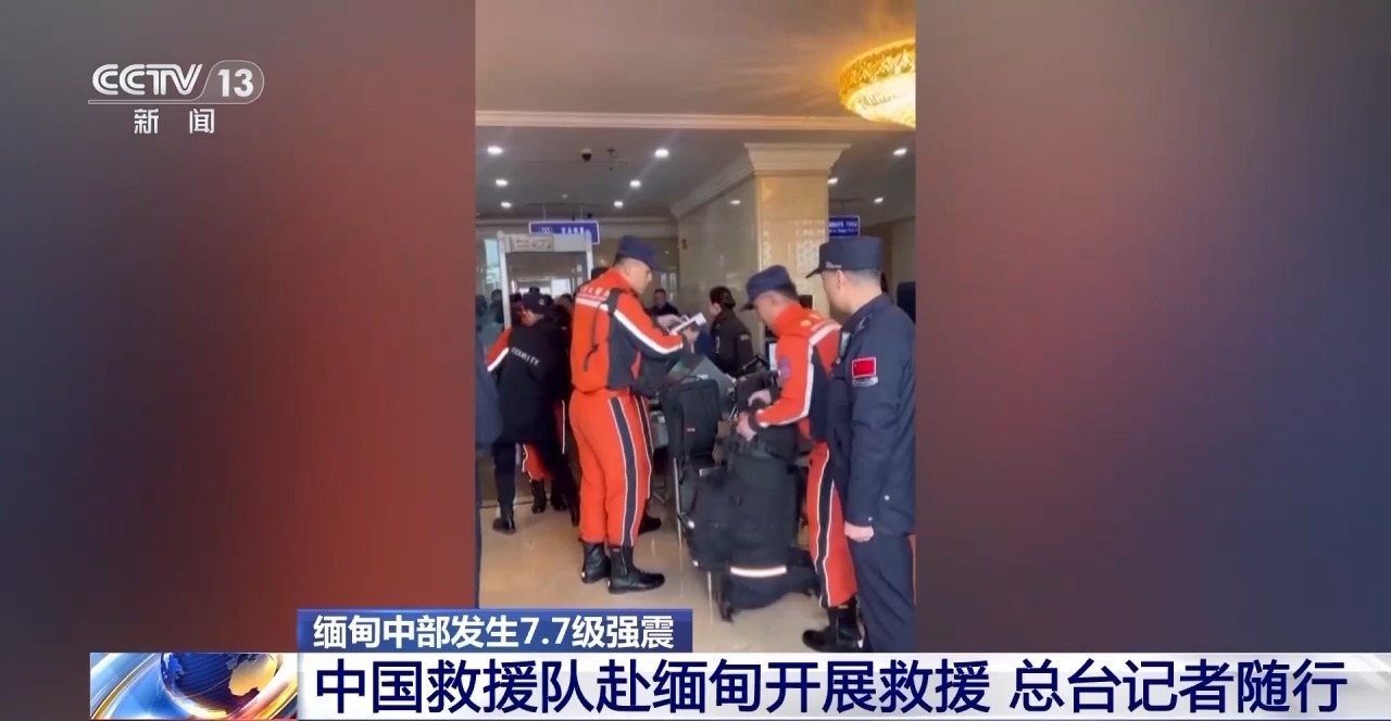 总台央视记者 张腾飞:我身后还有很多中国救援队的队员在进行安检,为了方便这次中国救援队出行,边检的警察通过一个简易的通关程序,可以快速实现通关安检,我们会直接搭乘摆渡车前往停机坪去搭乘这次的国航包机,前往缅甸地震灾区。