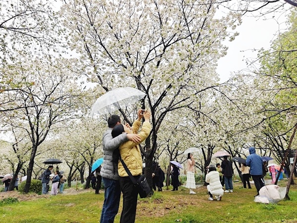风雨的痕迹依然还在,许多樱花树下一片粉白花瓣。经历降温降雨天气后,部分中樱悄然凋落,可仍有许多枝头留存着它们的风姿。现在的中樱带着几分历经风雨后的淡然,依旧散发着独有的清新气息,与周遭新叶相互映衬。不少游客撑着雨伞,在樱花树下打卡拍照,游兴不减。