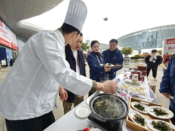 市民在推介会现场品尝干制洪山菜薹烹饪的干锅菜品 摄影:楚天都市报极目新闻记者曹磊