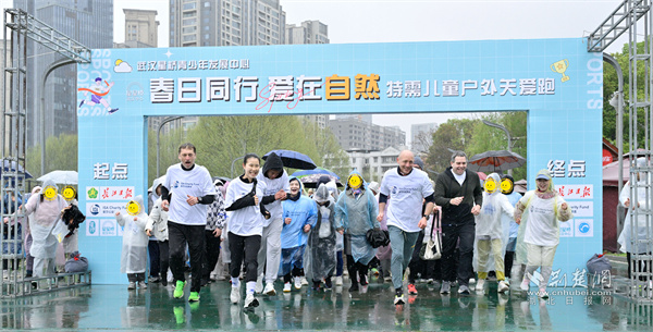 “慢点没关系,我们看看江边的花好不好?”奔跑过程中,武汉大学“星星点灯”志愿服务队和湖北大学师范学院的志愿者陪伴孩子们一同奔跑。他们用笑容和耐心打破沟通的壁垒,为这些特殊跑者筑起爱的屏障。