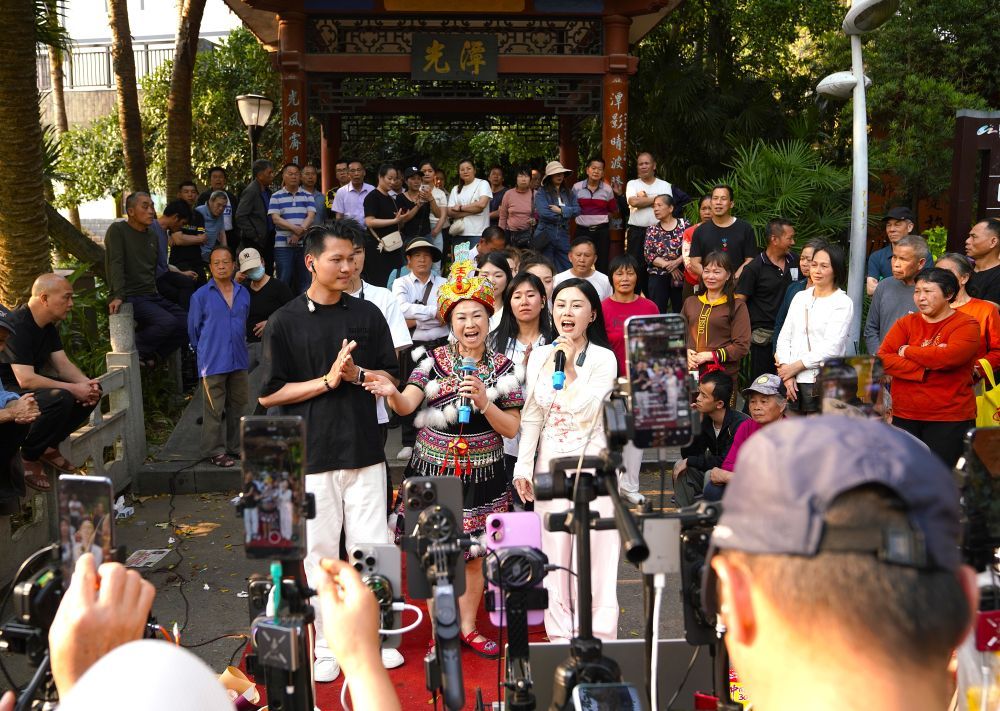 在“清唱街”,众多爱好山歌的群众三五成群围坐在一起,用传统吟唱的方式对唱山歌,一唱一和间细数岁月流淌。不远处的歌台上,众多年轻的山歌手“装备齐全”,麦克风、音响、声卡等各式声乐器材一应俱全,而通过数十部手机的网络直播,已将欢快的歌声通过“云端”传至四海,触达到更多观者。