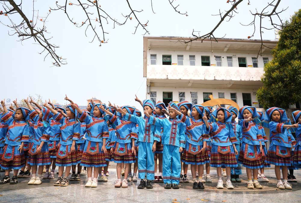 在广西南宁市武鸣区的太平镇庆乐小学,山歌嘹亮。舞台上,伴随木棉花随风飘落,身着民族服饰的孩子们在老师的带领下欢唱《礼仪歌》《数星星》等新曲。“我会一直唱下去,因为这是我们引以为豪的文化。”五年级学生韦思妍说。