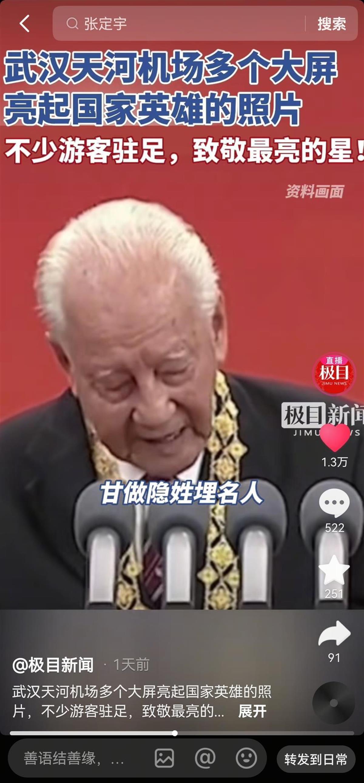 安徽网友@小小马兰花说:全国都应该向武汉天河机场学习,大力弘扬为国家鞠躬尽瘁的科学家及英雄们。