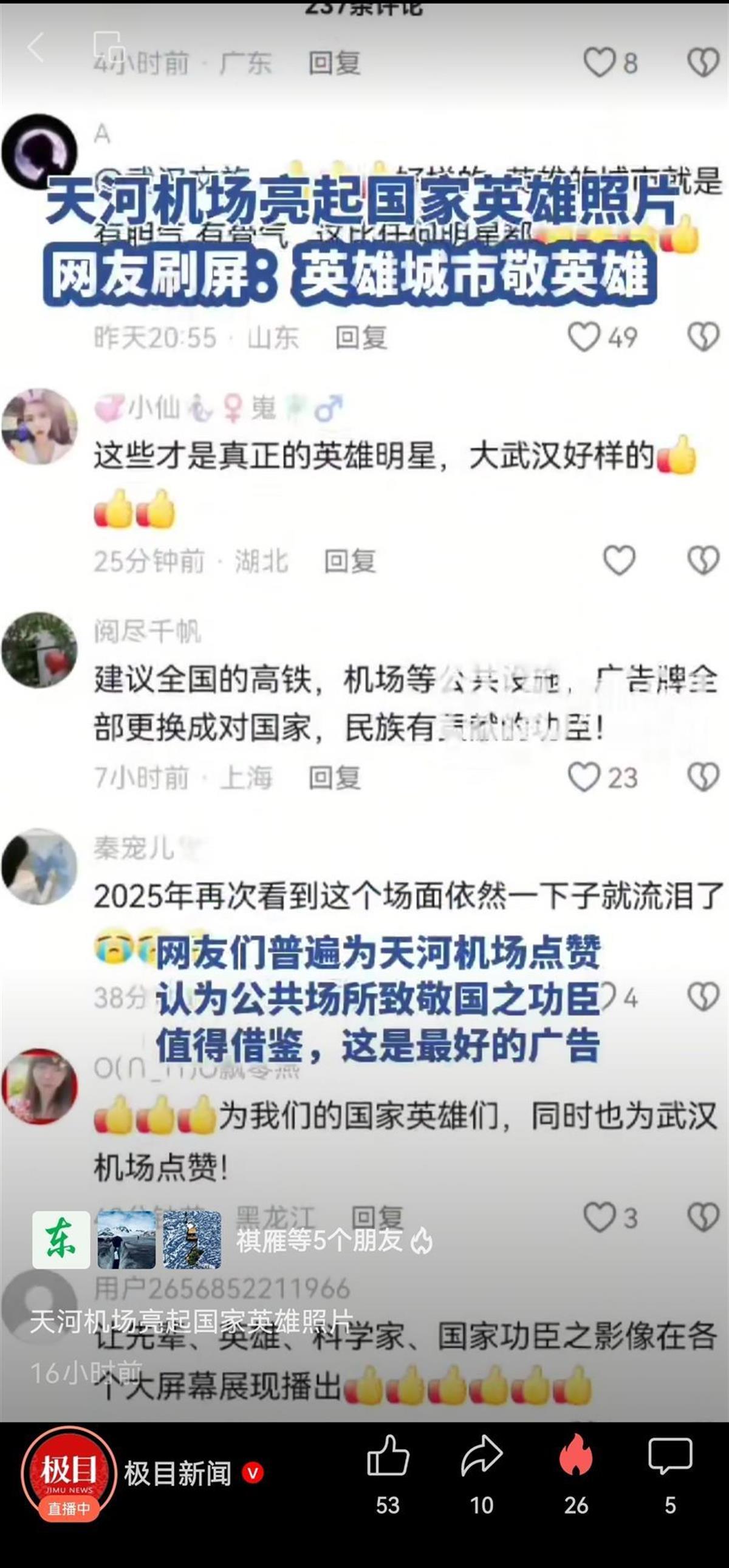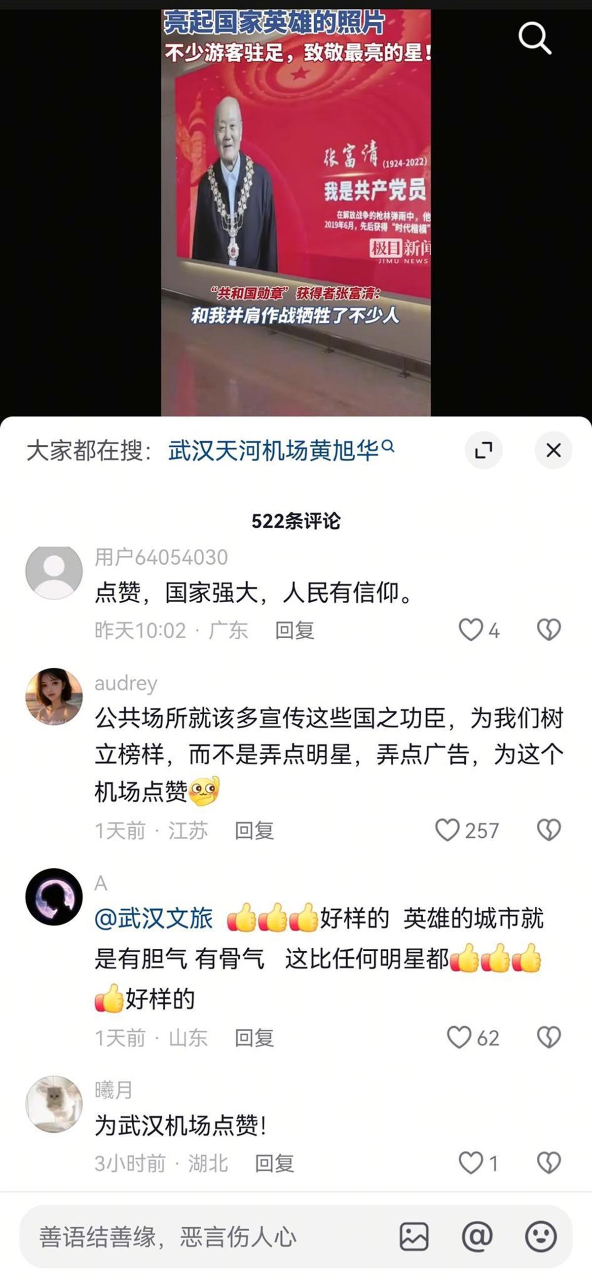 不少网友对此事给予高度评价。江苏网友@audrey说,公共场所就该多宣传这些国之功臣,为我们树立榜样,为这个机场点赞!