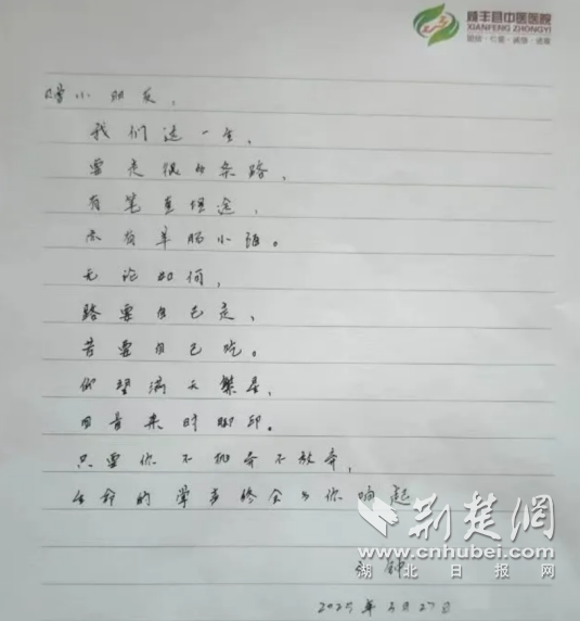 荆楚网(湖北日报网)讯(通讯员吴欢、汤应彬)“我们这一生要走很多条路,有笔直坦途,亦有羊肠小陌 …… 只要你不抛弃不放弃,生命的掌声终会为你响起!”3月27日,武汉市第一医院帮扶咸丰县中医医院皮肤科专家刘钟,上门为戴军(化名)复诊时,为他写下暖心“医嘱”。