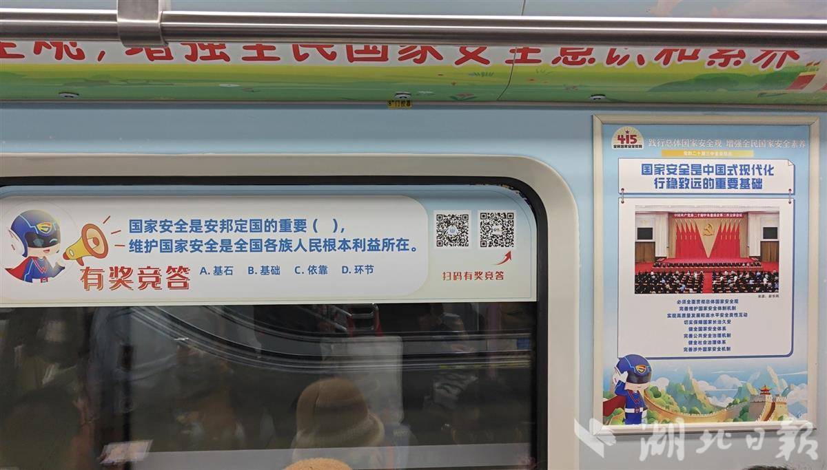 “践行总体国家安全观,增强全民国家安全素养”“国家安全是民族复兴的根基,社会稳定是国家强盛的前提……”走进武汉轨道交通2号线“国安号”专列车厢,醒目的国家安全知识展板上,随处可见武汉市国家安全IP形象“武小安”的身影。