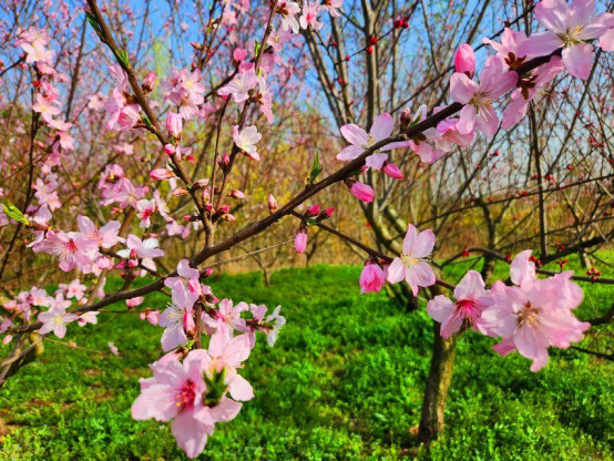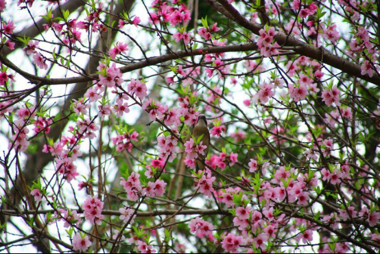 这几天暖日融融,蓦然发现,整座桃园已经沸腾。你瞧,那枝上的花苞有的如时尚活泼的少女,轻启樱桃般可爱的小嘴,纵情唱着笑着;有的如怀春初恋的姑娘,犹说还羞半遮半掩;有的似憧憬未来的女孩,把心底的秘密捂得紧紧的,春风悄然赴约,花苞脸颊泛起红晕,那粉红的心事便从花苞的间隙泄露出来。