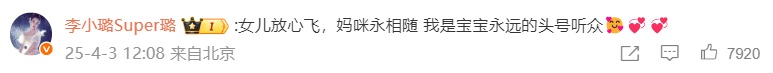 在评论区,甜馨的爸爸妈妈贾乃亮和李小璐也纷纷留言为其助力: