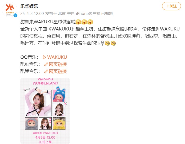 4月3日,乐华娱乐官方账号发文:甜馨来WAKUKU星球做客啦,全新个人单曲《WAKUKU》趣萌上线,让甜馨清泉般的歌声,带你走近WAKUKU的奇幻旅程,乘着风,追着梦,在森林的臂膀里开始欢脱神游,唱四季、唱自由、唱远方,在时间琴键中滑过探索生命的乐章。