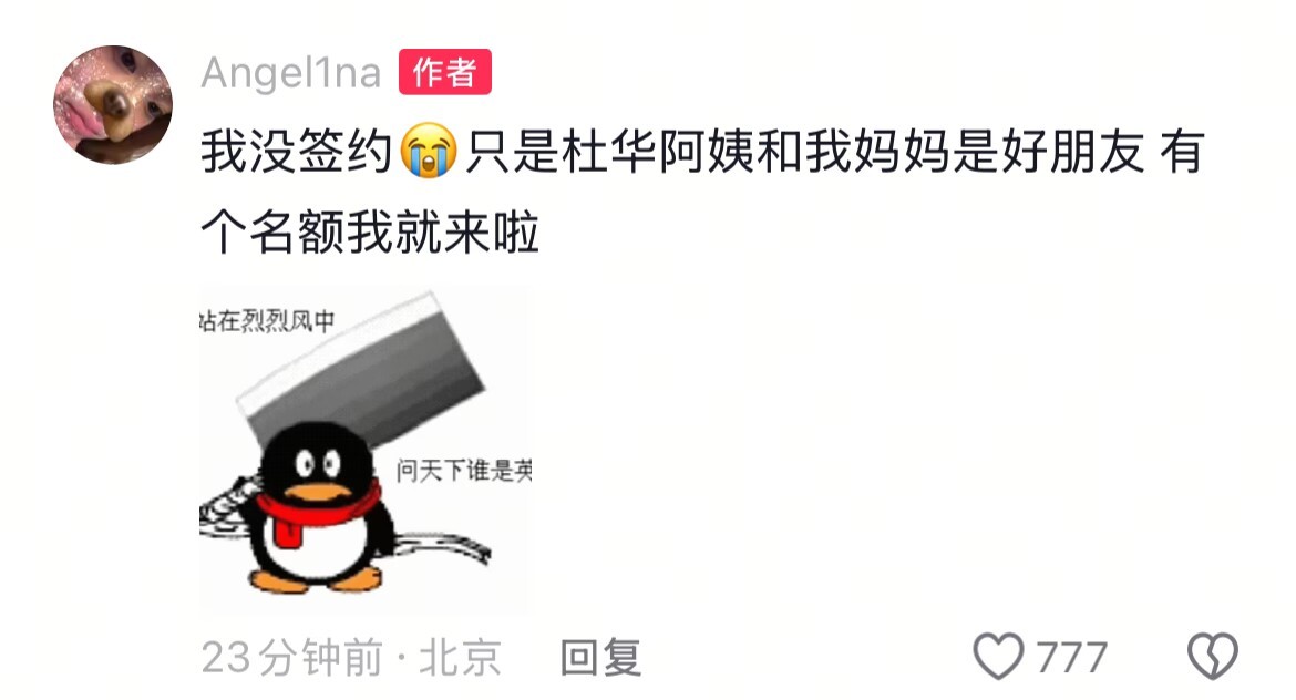 当天下午,甜馨也在个人账号回应表示:“我没签约,只是杜华阿姨和我妈妈是好朋友,有个名额我就来啦”