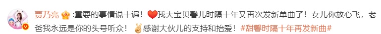 “重要的事情说十遍!我大宝贝馨儿时隔十年又再次发新单曲了!女儿你放心飞,老爸我永远是你的头号听众!感谢大伙儿的支持和抬爱!#甜馨时隔十年再发新曲# ”