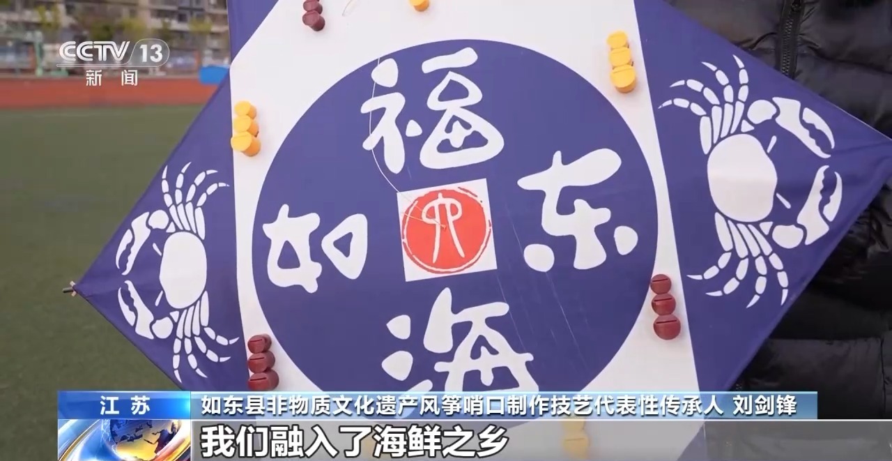 如东县非物质文化遗产风筝哨口制作技艺代表性传承人 刘剑锋:骨架用了碳纤维材料,不仅硬还轻,风筝放飞比以前更容易了。我们现在通过AI生成画面,融入了海鲜之乡、风筝之乡。哨口以前是纯手工的,竹子做的,现在通过3D打印做成塑料的哨口了。