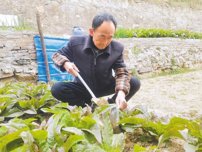 临行前,方汉炳老人在自家屋后采集土壤。(湖北日报全媒记者 王婧 摄)