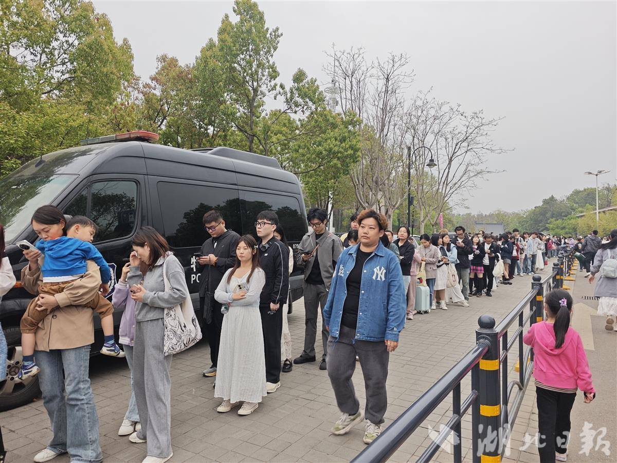 目前,东湖樱花园中樱退场,晚樱绽放,关山、普贤象、松月、郁金等品种都不甘示弱,纷纷展露芳颜。游客依旧热情不减,3条直达樱园的定制公交循环发车,人满即走,等车的乘客排起近百米长队。