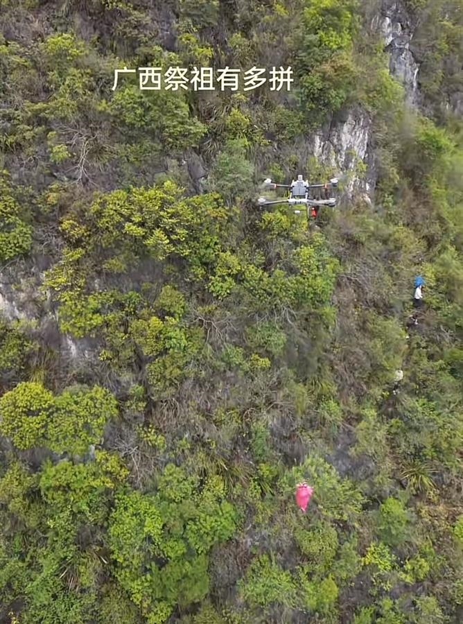 “我们家祖辈的墓地都在山上,有的位于五六百米的地方。”韦先生说,“以前没有无人机的时候,每次扛祭品上山都要花一个多小时,现在用无人机,只需要五六分钟即可将祭品运送到400米的山上。”