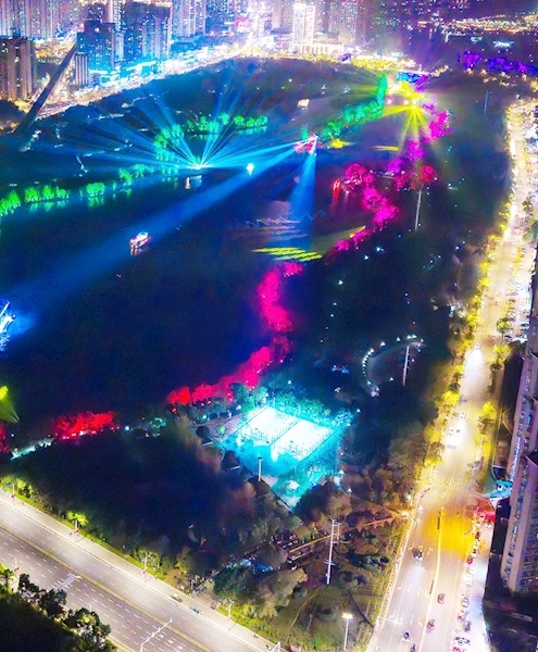 《槐荫船说》为华中首部大型行浸式水上夜游演出。以国家级非遗“董永传说”故事为魂,运用5D全息投影、智能水幕等前沿科技,首创“水上行浸式观演”模式,通过轻舟载客、景随船移、星空水幕构筑立体剧场。以科技为笔,光影为墨,在4.5公里流动舞台之上演绎“天界-人间-仙境”三重时空视觉奇观,重绎东方爱情史诗。