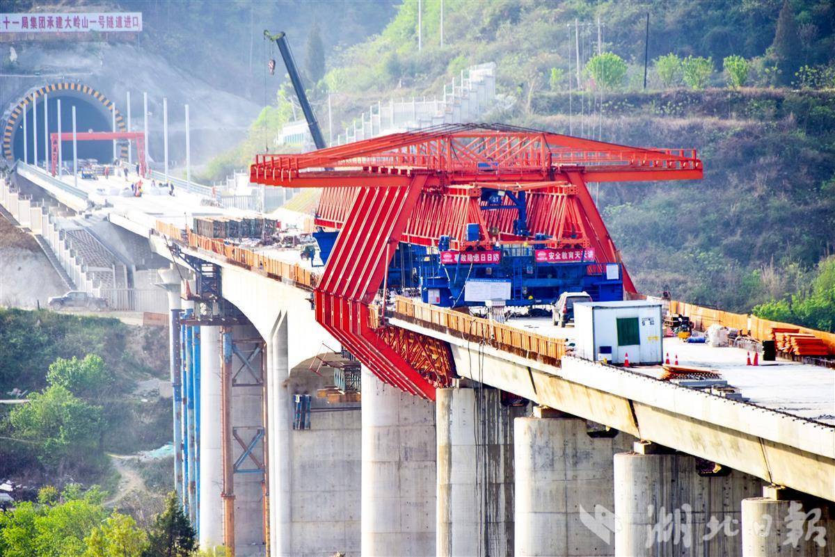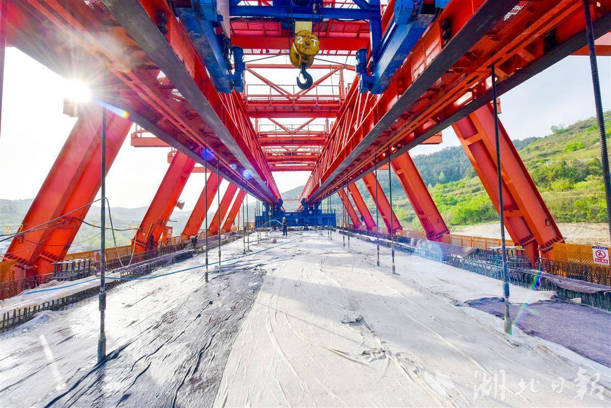 4月6日,十堰市郧阳区茶店镇樱桃沟村西十高铁樱桃沟特大桥合龙。该大桥全长625.08米,合龙段长32米,宽12.5米,浇筑混凝土300多立方,目前合龙桥面正在浇水养护。西十高铁全长256.7公里,设计速度350公里/小时,建设工期3年,线路西起陕西省西安市,穿越秦岭山脉,经商洛和十堰两市,与武汉至十堰高铁相接,形成武汉至西安快速铁路客运通道。(视界网 周家山 摄)