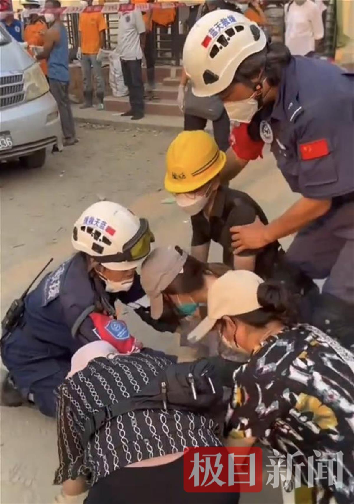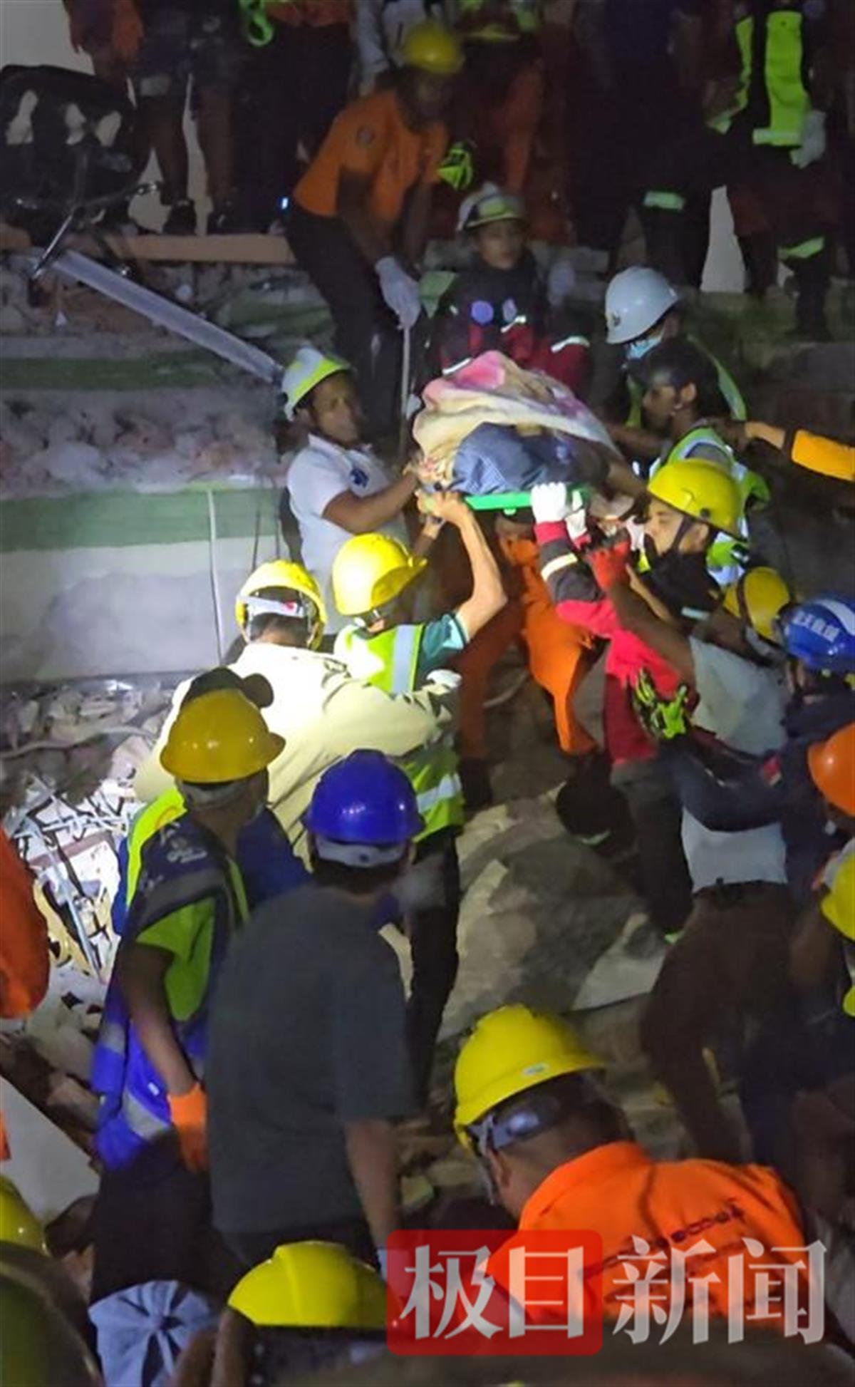 在曼德勒一处倾斜的酒店,中国国际救援队和厦门市曙光救援队、上海三栖救援队为了一丝微弱的信号,坚守了两个通宵,现场搜救近40个小时。