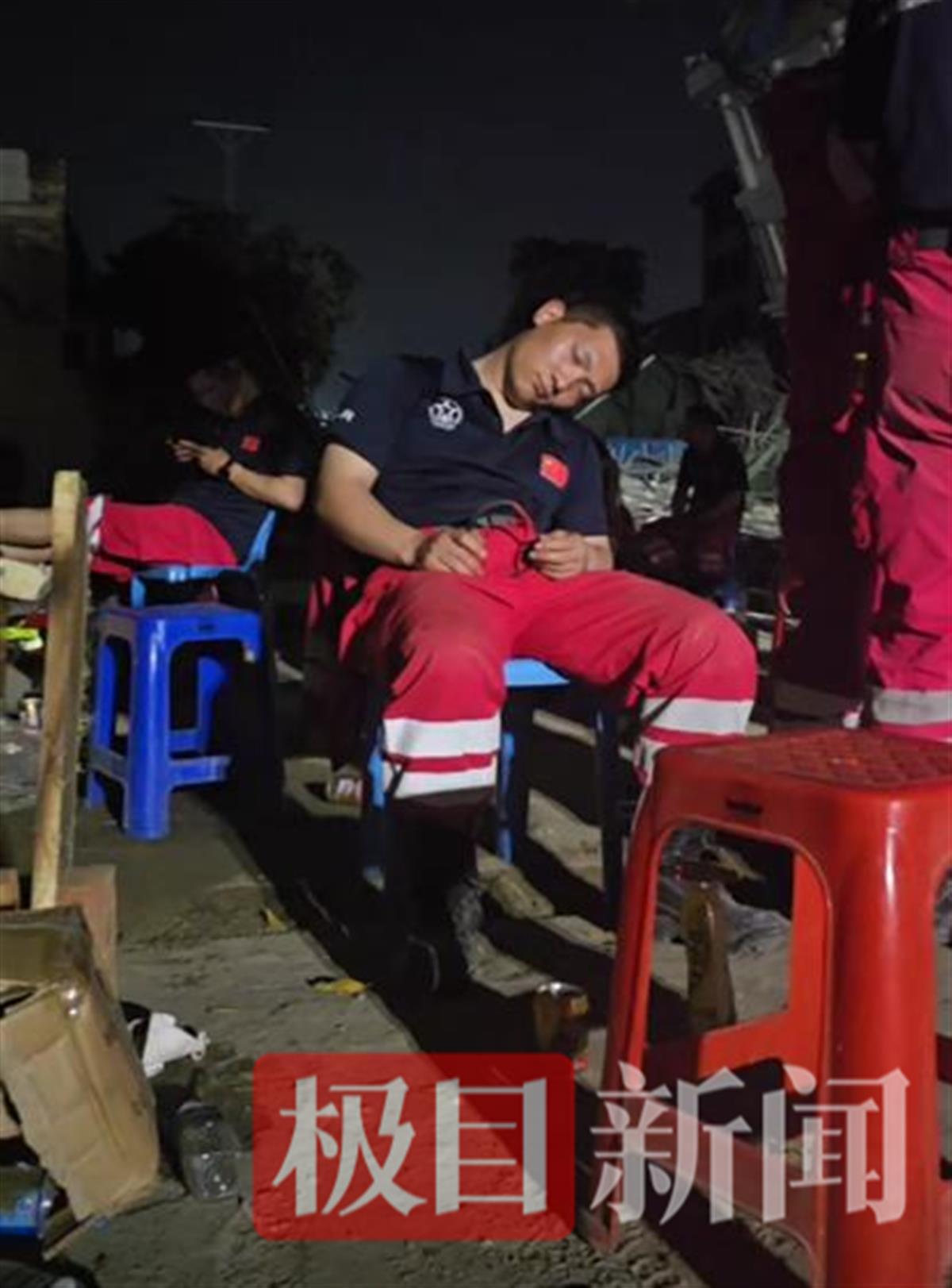 救援队员太累,歪着头就睡着了(极目新闻记者 满达 摄)