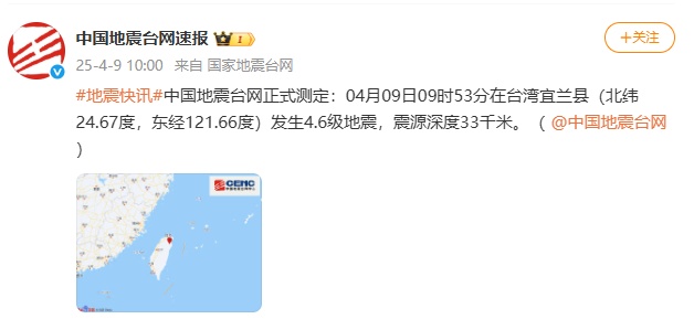 中国地震台网正式测定:4月9日9时53分在台湾宜兰县(北纬24.67度,东经121.66度)发生4.6级地震,震源深度33千米。