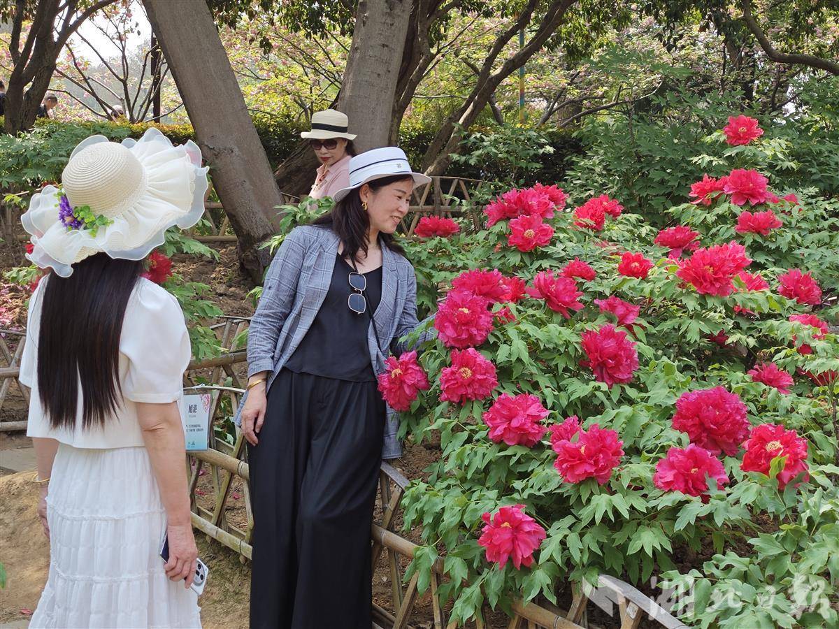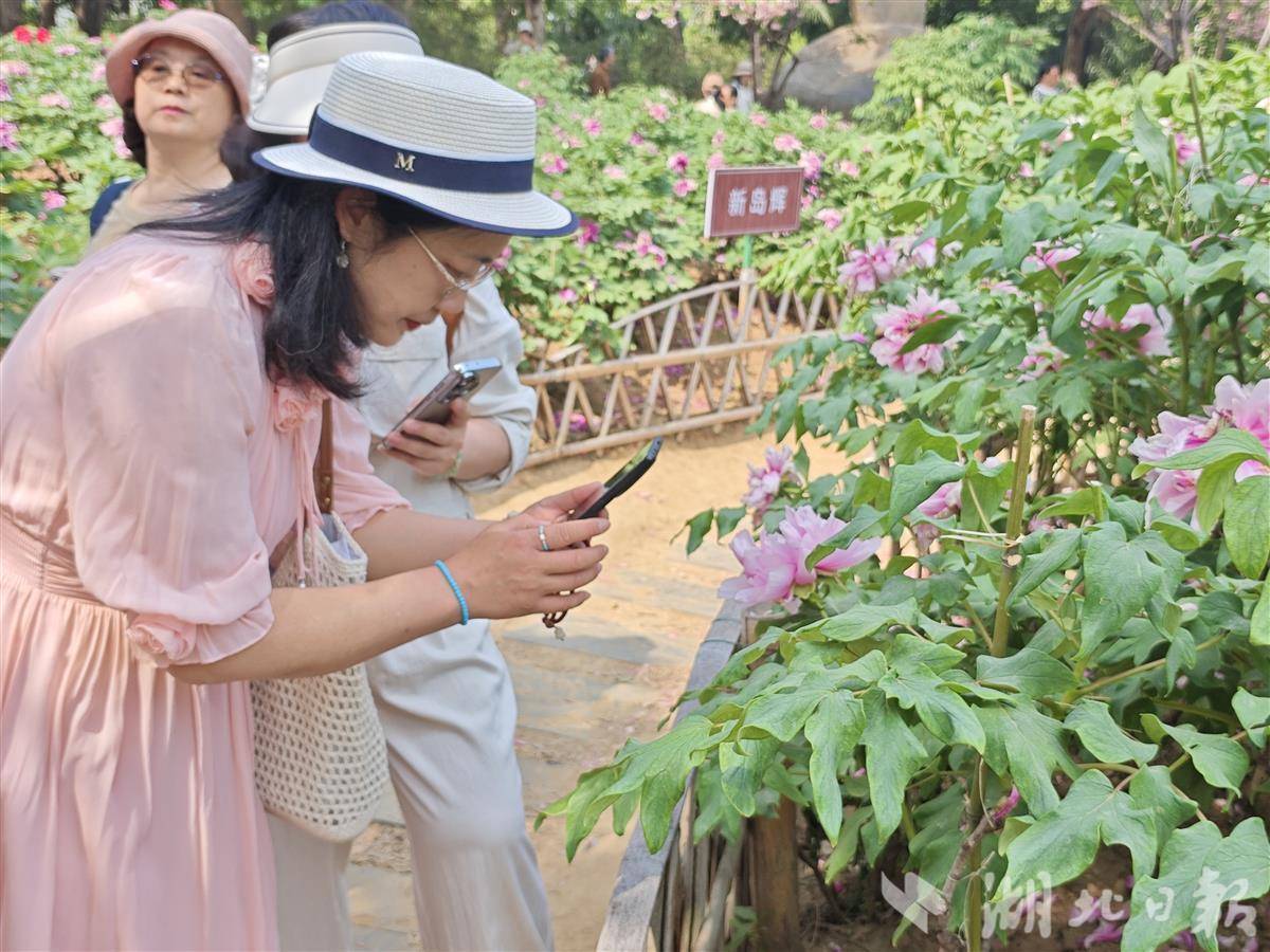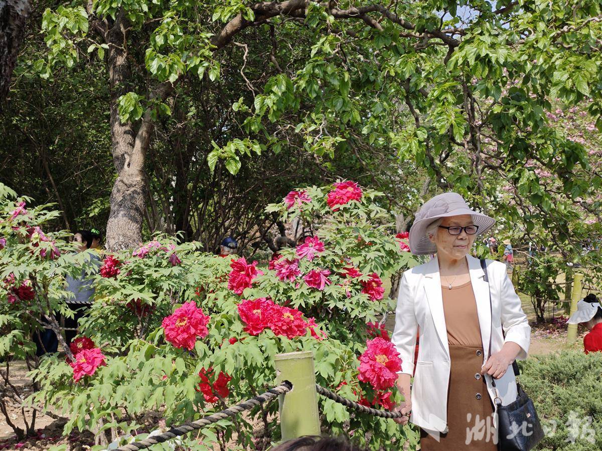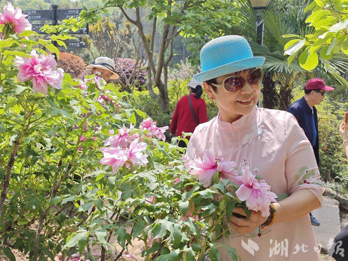 比万紫千红的花海更鲜艳的,是身着多彩服装的游客们。“以前还专门去洛阳看牡丹,现在才发现家门口的花同样动人。”4月8日,家住汉口的周婆婆跨江前来,穿着一袭蓝色旗袍,肩披红色丝巾,指挥老伴给自己多角度拍照。还有头发簪花、身着白裙的吴阿姨,一边看花一边打电话呼吁朋友们:“你们赶紧来,今天下午就来,花开得正好。”她说今天特意穿了跳广场舞的演出服,“看到鲜花感觉自己都变年轻了,充满了春天的能量。”记者看到,牡丹园中,以中老年为主的“夕阳红”游客数量十分庞大,女士们穿上旗袍、长裙,手持丝巾、团扇,男士戴着墨镜和草帽,与成片盛开的牡丹花相映成趣。