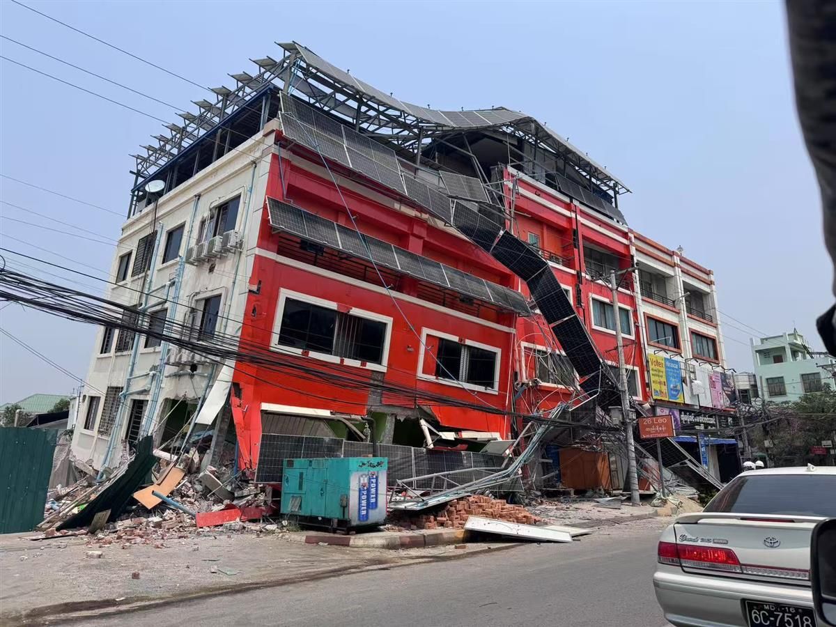 3月30日,随救援队进入曼德勒,路边一栋受损严重的楼房