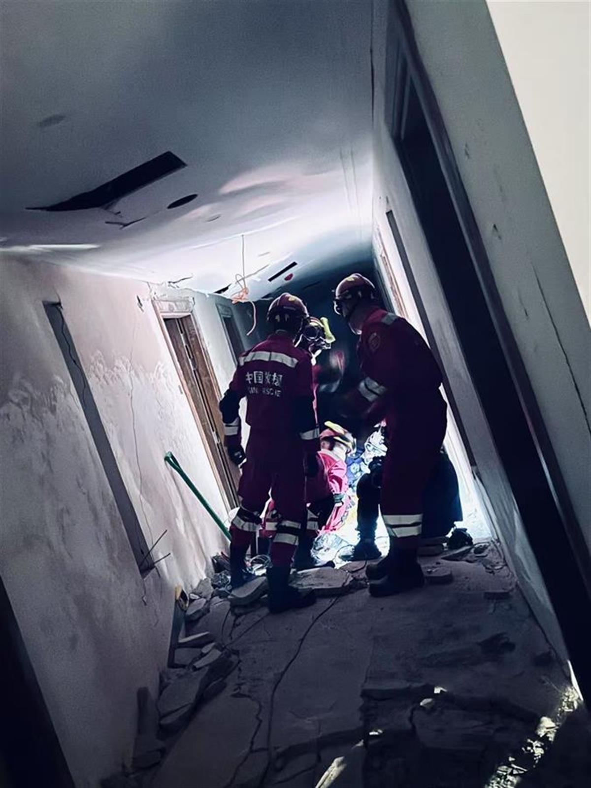 中国救援队在倾斜的楼房里破拆