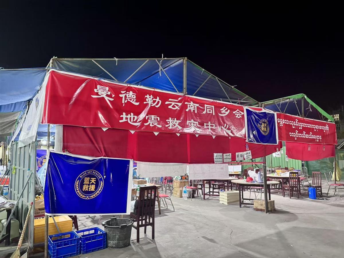 落地曼德勒,我们被大客车直接送到了曼德勒的云南会馆,这是祖籍云南的华人组成的社会组织。云南会馆内,已经搭建起了数个帐篷,现场挂牌成立地震救灾中心,一车车从仰光等地捐赠而来的物资送往云南会馆,年轻的志愿者们排队接力将物资一件一件卸下。会馆里组建了车队、捐款、网络、后勤、医生等部门,为救援队提供后勤保障工作。