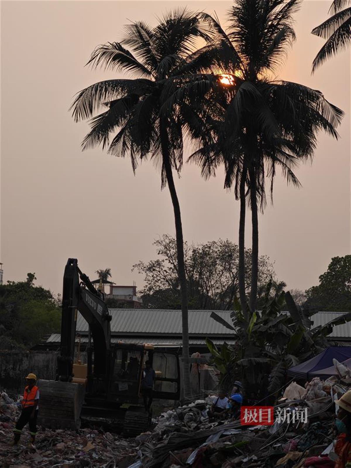 我从来没有这么近距离地感受过生与死的距离。在现场,我会经常恍惚,很难想象这个由钢筋、石板、泥块构成的庞然大物下埋着一条条生命,数个家庭、数段幸福的时光就在地动山摇的一瞬间被终结。在坍塌的天空公寓前,有几棵高大的棕榈树,如今挺立在垃圾和杂物中,是坍塌的废墟里保留的唯一一处景观。已至傍晚,落日余晖透过树叶斜斜洒了下来,显得柔和又温情,不难想象出,曾住在这里的人,或许数次透过窗户看着这些高大的树,看透过树叶洒下的余晖,而今他们中的一部分永远留在这片废墟之下。