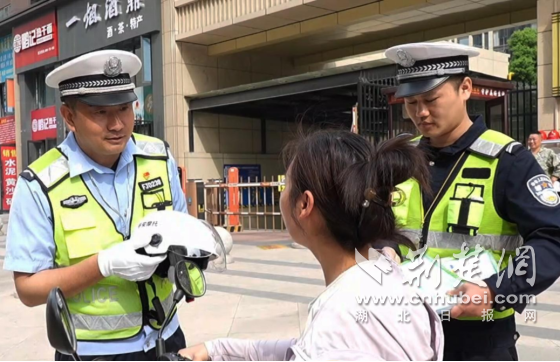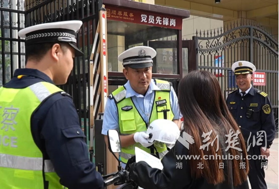 荆楚网(湖北日报网)讯(通讯员 王俊 黎阳宏)“不能为了应付检查而戴头盔,您佩戴的这个头盔一定要把它扣好……”4月9日,这一句句温馨的提醒的声音出现在钟祥市各个小区的门口。