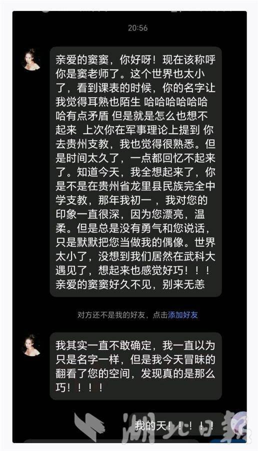 去年秋季,她考入武汉科技大学。今年春季,拿到《军事理论》课的课程表,她眼前一亮:“授课老师窦薇!好像7年前来支教的‘豆豆老师’也叫这个名字!”