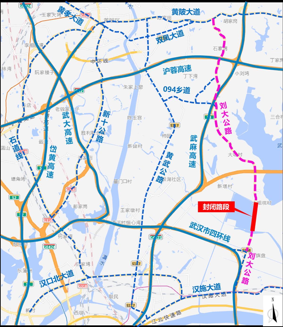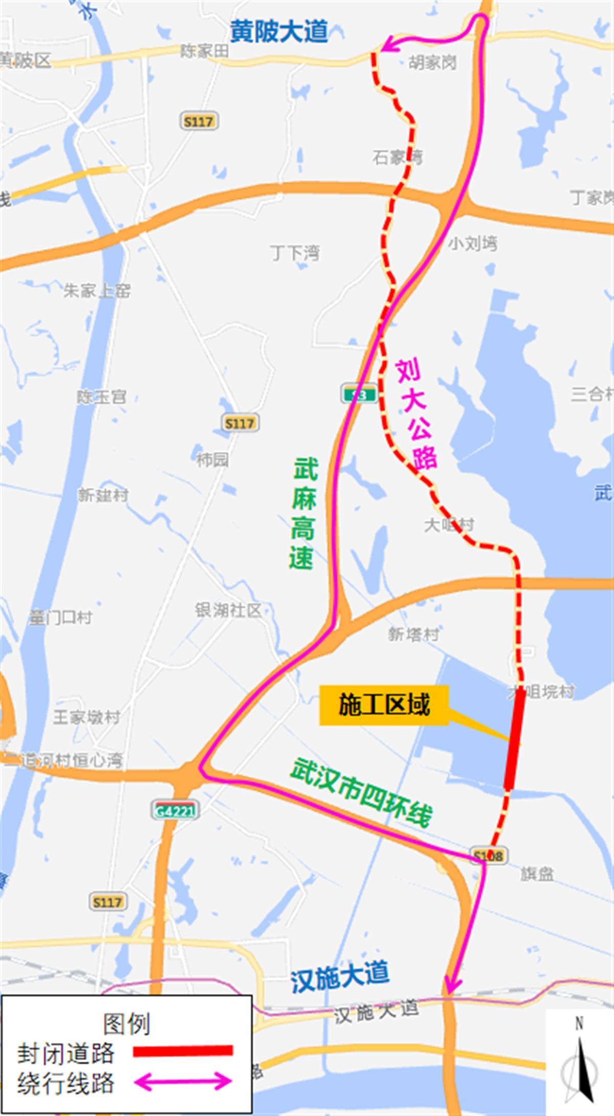 二、原通行刘大公路的机动车,也可以选择绕行武汉市四环线、武麻高速。
