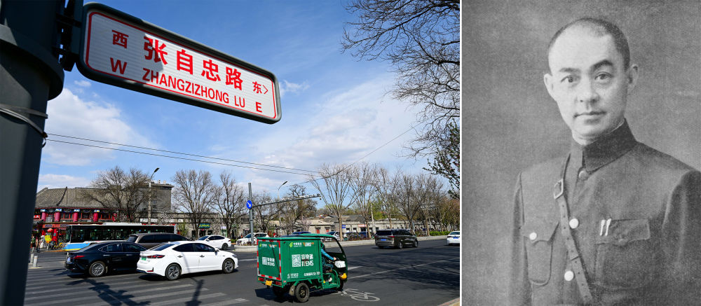 拼版照片:左图为北京市东城区张自忠路(3月27日摄);右图为张自忠像(资料照片)。