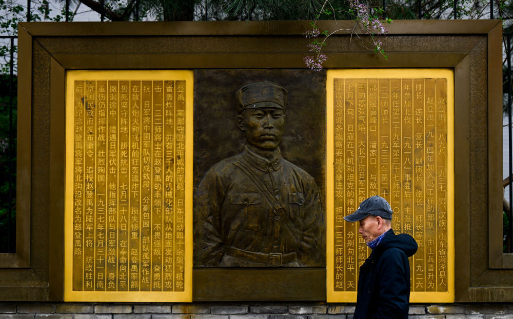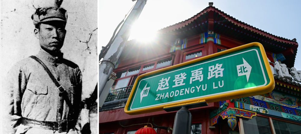 拼版照片:左图为赵登禹像(资料照片);右图为北京市西城区赵登禹路(3月26日摄)。