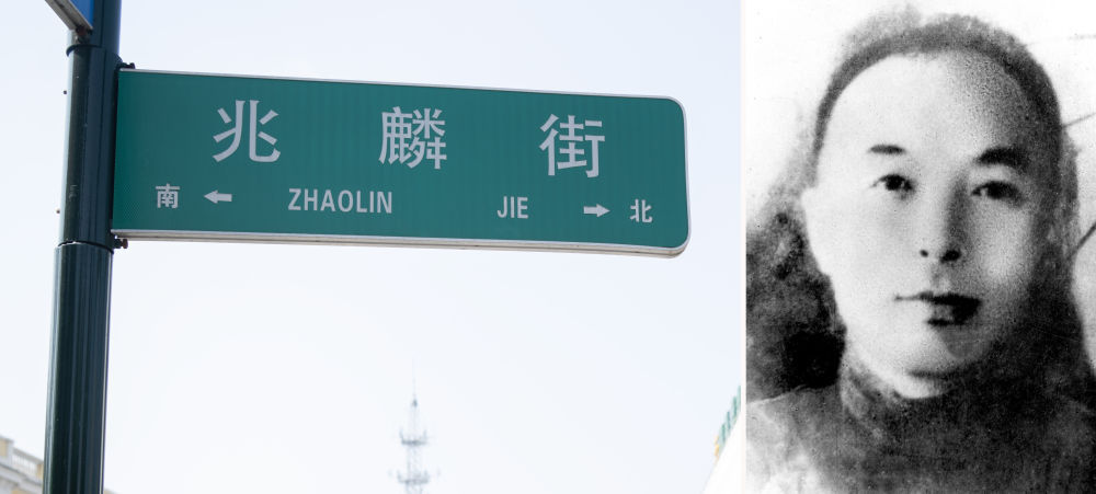 拼版照片:左图为哈尔滨市道里区兆麟街(4月8日摄);右图为李兆麟像(资料照片)。