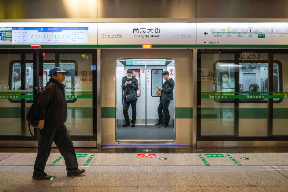 在哈尔滨市道里区,人们在尚志大街地铁站内乘车(4月8日摄)。