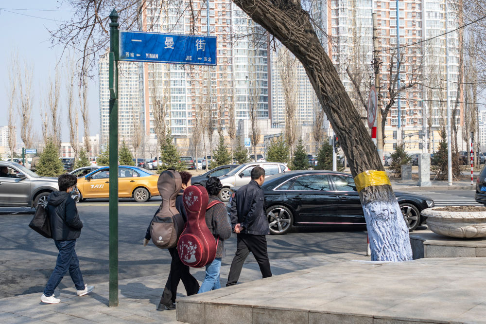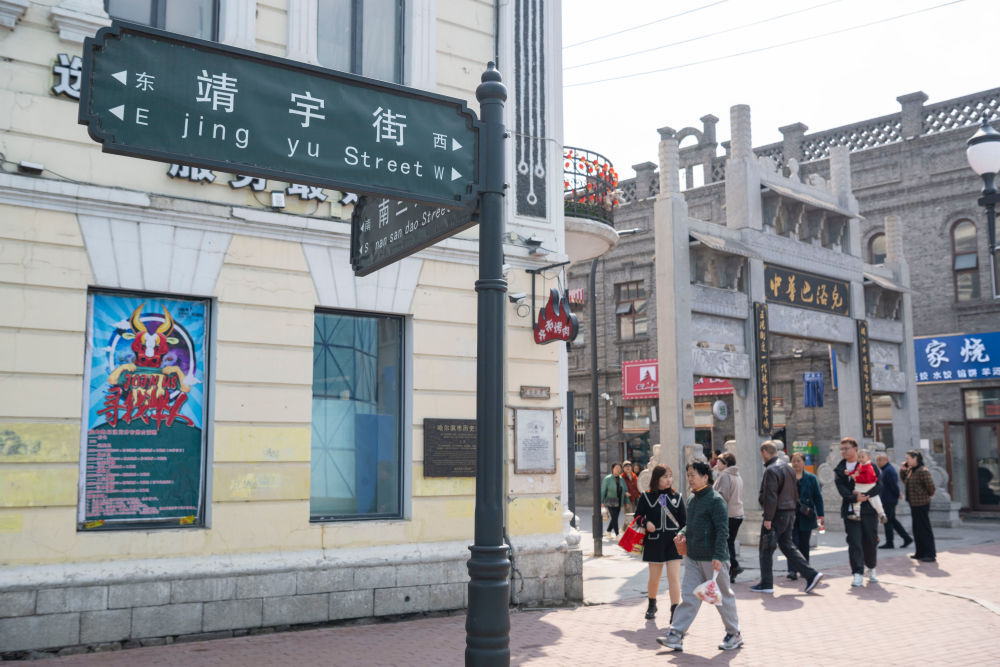 人们走在位于哈尔滨市南岗区的一曼街上(4月8日摄)。