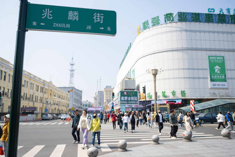 在哈尔滨市道里区,人们行走在兆麟街上(4月8日摄)。