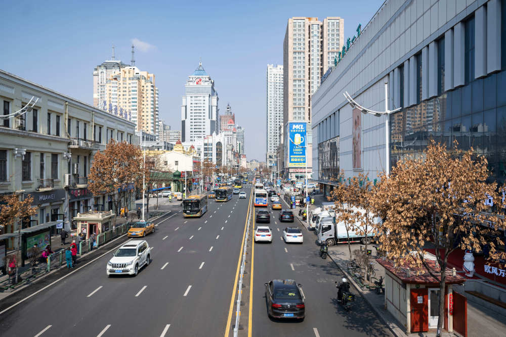 在哈尔滨市道里区,车辆在尚志大街上行驶(4月8日摄)。