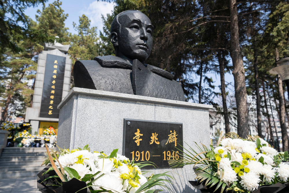 在哈尔滨市道里区兆麟街北端的兆麟公园,李兆麟将军墓前摆满了鲜花(4月8日摄)。