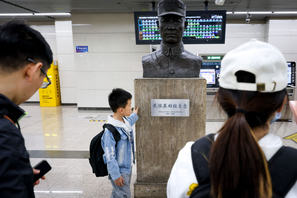 在北京地铁张自忠路站,乘客们瞻仰张自忠将军像(4月4日摄)。