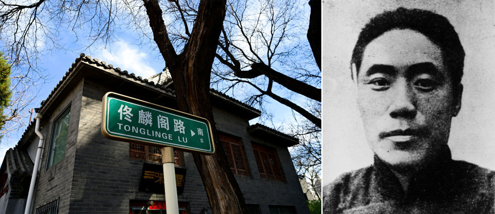 拼版照片:左图为北京市西城区佟麟阁路(3月25日摄);右图为佟麟阁像(资料照片)。
