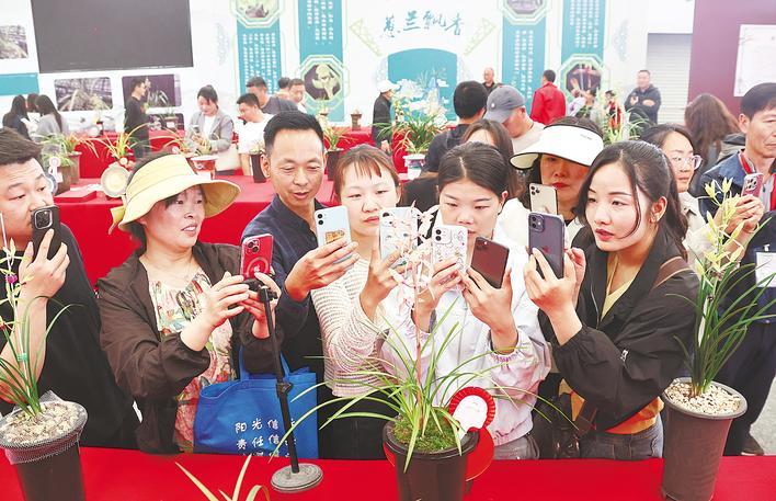 随县第六届兰花博览会上,爱好者争相拍摄获奖兰花。(湖北日报全媒记者 陈迹 摄)