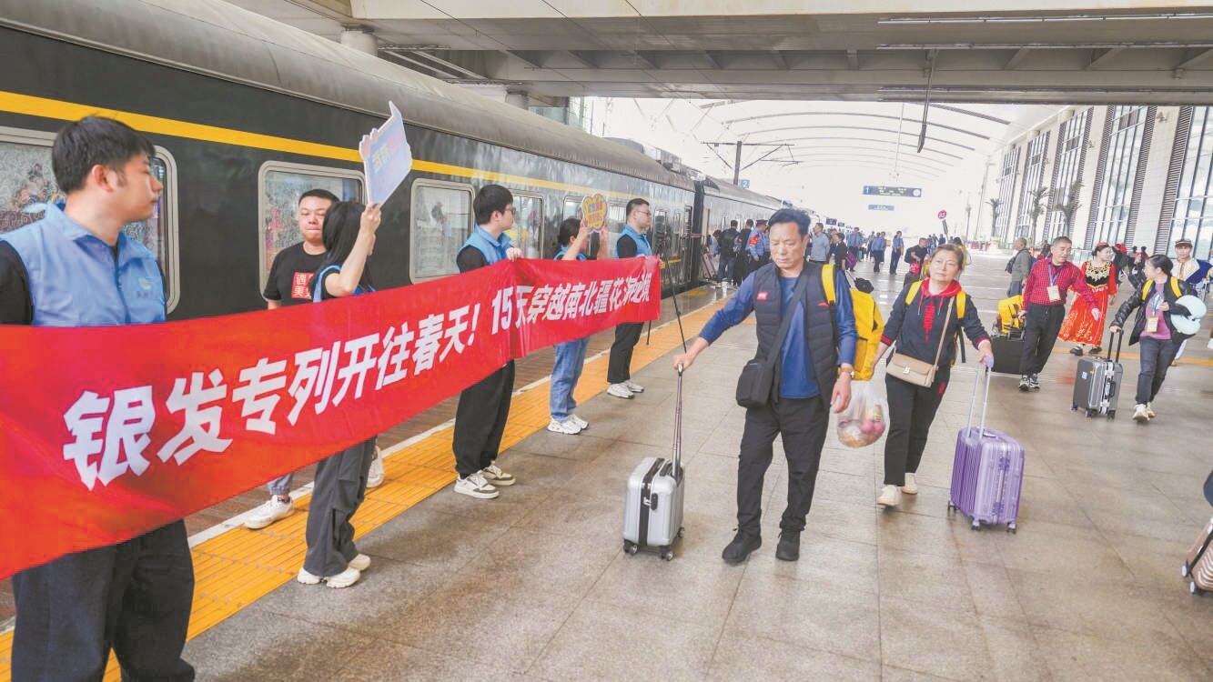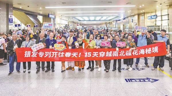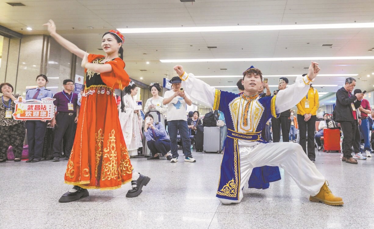 4月9日上午,武昌火车站至新疆乌鲁木齐的银发旅游专列开通。极目新闻记者在候车厅一层看到,专属候车厅座无虚席。两名特邀的新疆籍演员身着民族服饰,正在为大家表演新疆舞。首批尝鲜的游客积极和他们互动,最后开心地登上了专列。据悉,他们将在15天内随车畅游全疆。