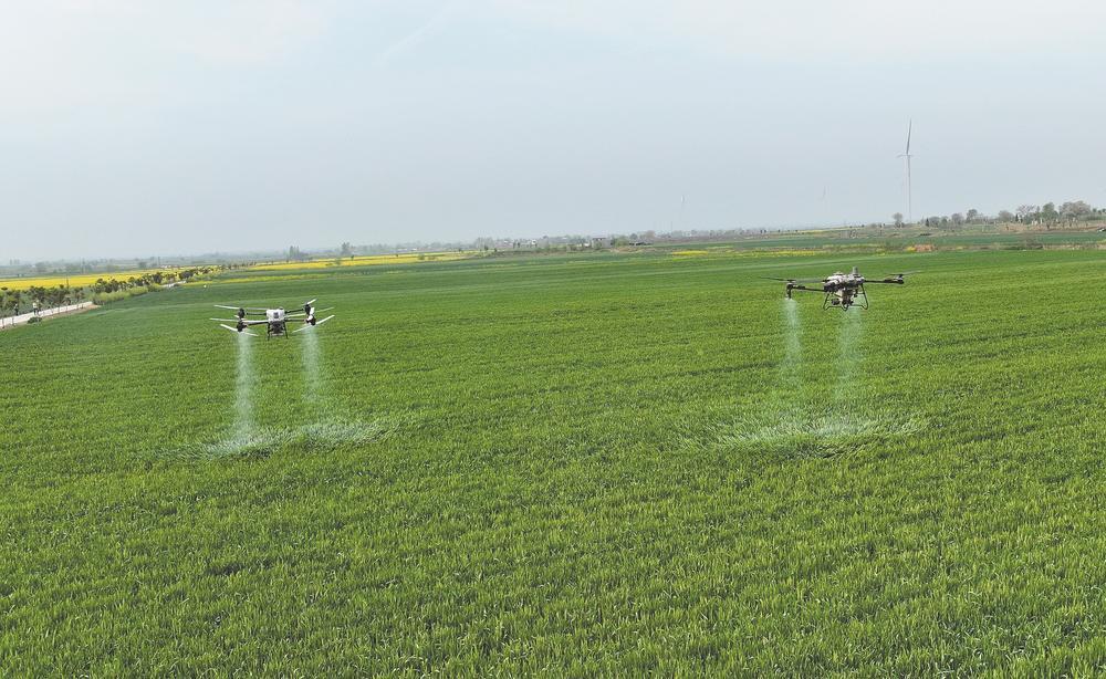 8日,在枣阳市七方镇刘寨村万亩小麦示范田,多台植保无人机均匀喷洒农药,防控小麦赤霉病。