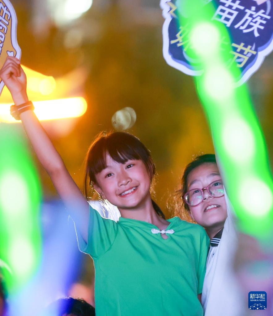 4月11日,小朋友在2025年贵州台江苗族姊妹节开幕式上观看表演。