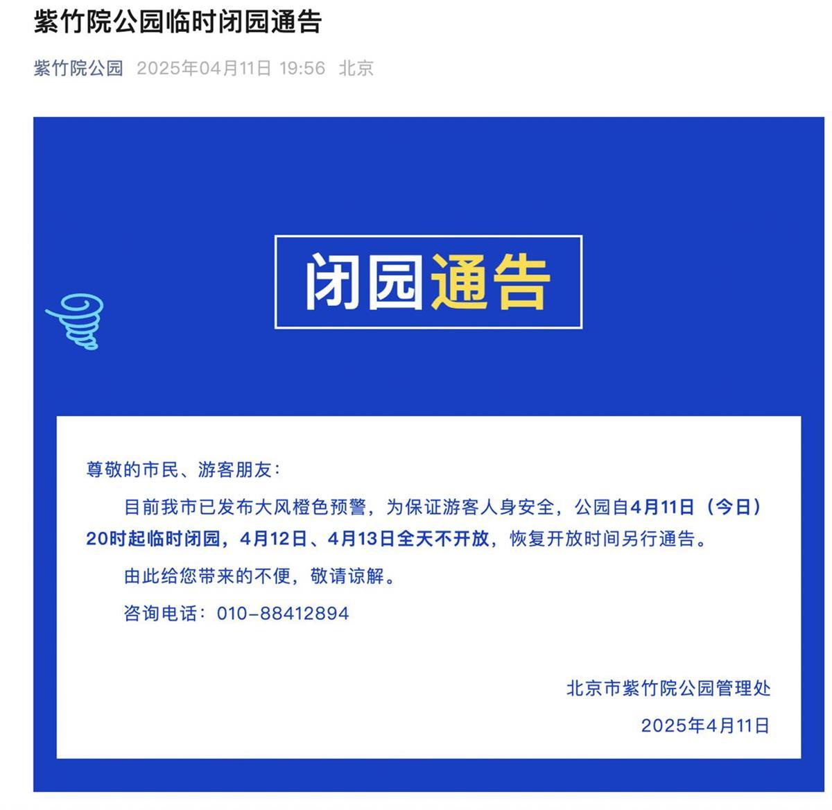 记者看到,截至11晚上9时许,北京城区内风力较弱,但多部门已发布紧急通知,要求做好大风天气应对工作。北京市颐和园管理处、紫竹院公园管理处、北海公园管理处发布公告称,目前北京市已发布大风橙色预警为保证游客人身安全,公园4月12日、13日闭园,恢复开放时间另行通知。