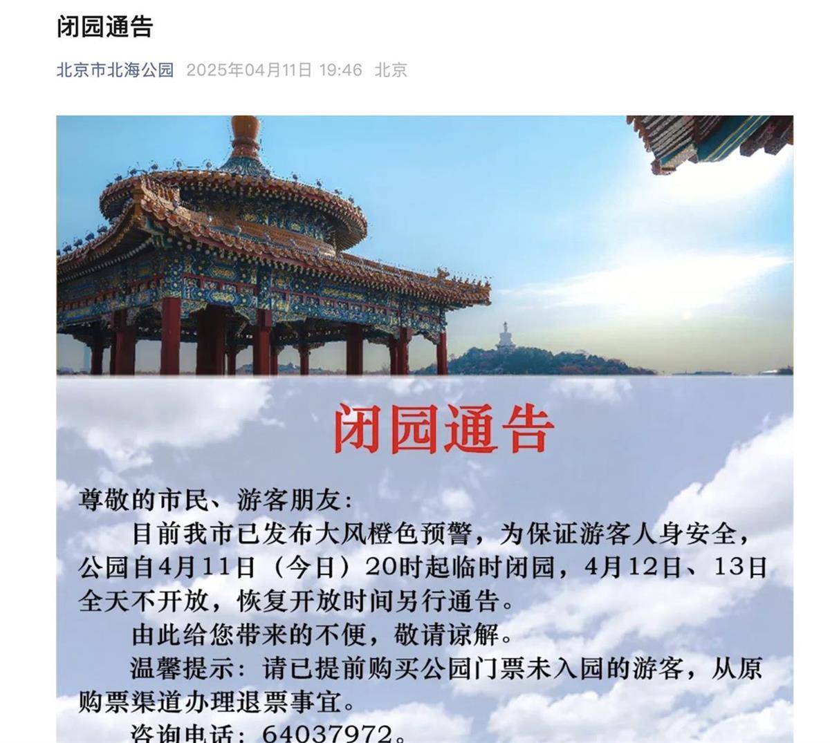 北海公园管理处发布闭园公告