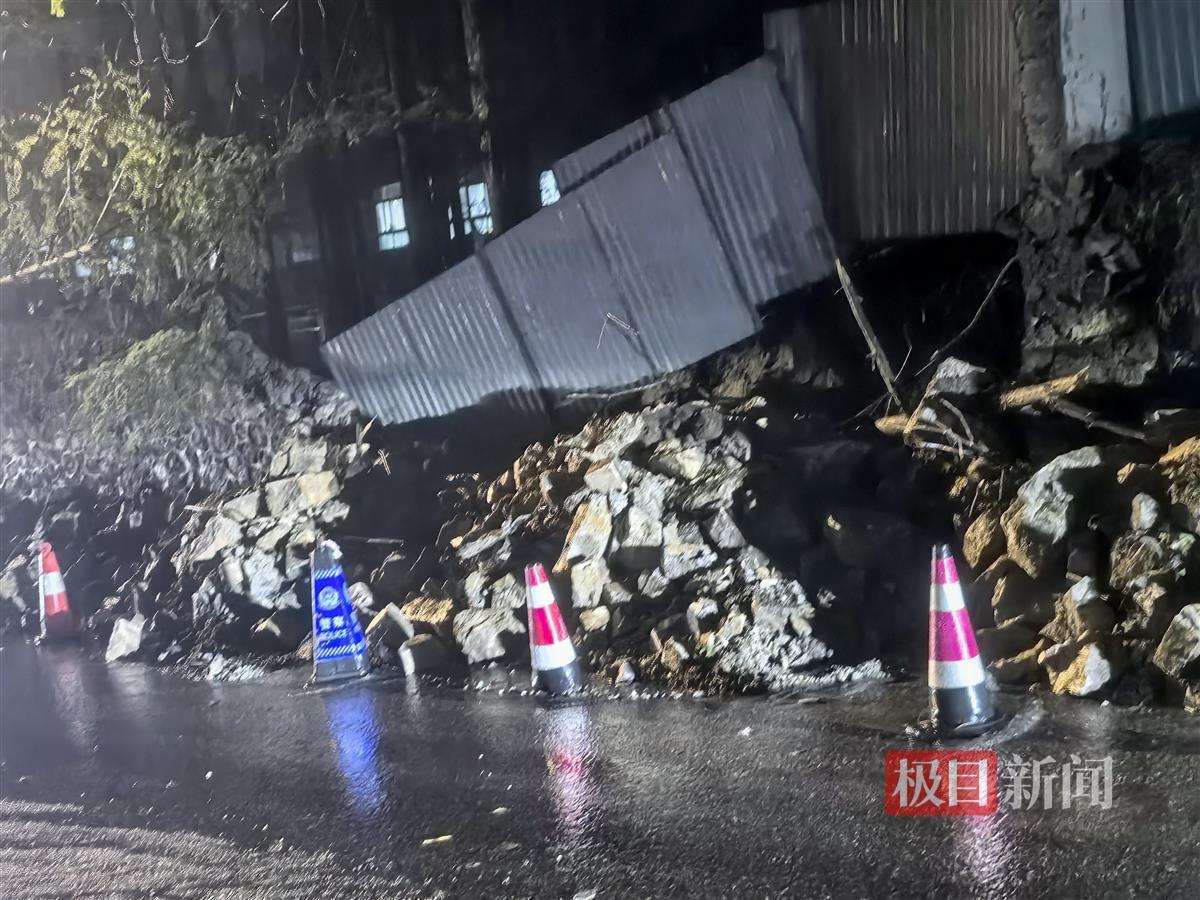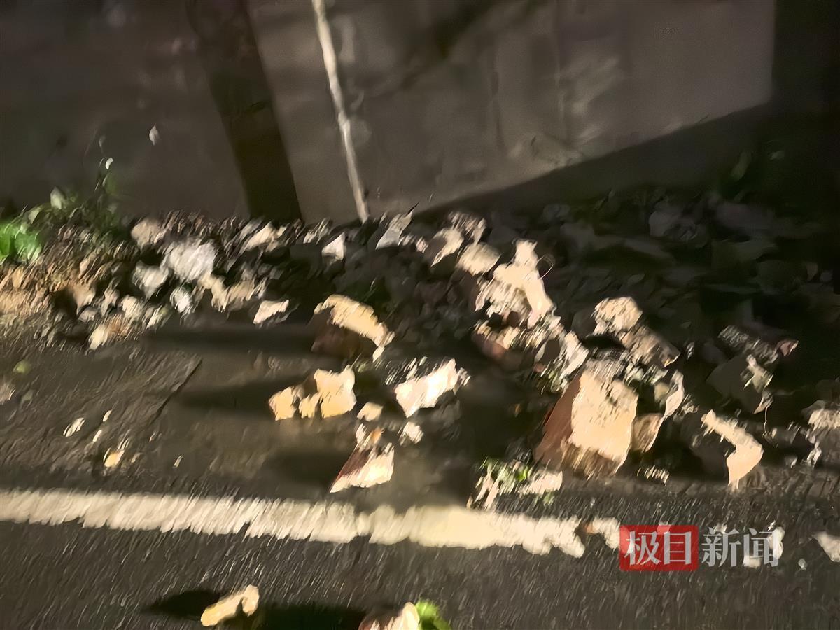 当日晚上8时许,极目新闻记者赶到事发现场时发现,江夏还在下着大雨,天空有闪电。记者注意到,车辆被砸这段路没有路灯,受损的车辆已经拖走,院墙倒塌后落下的砖石还堆放在路边,路边还有倒下的树木,有一排锥桶用作警戒。